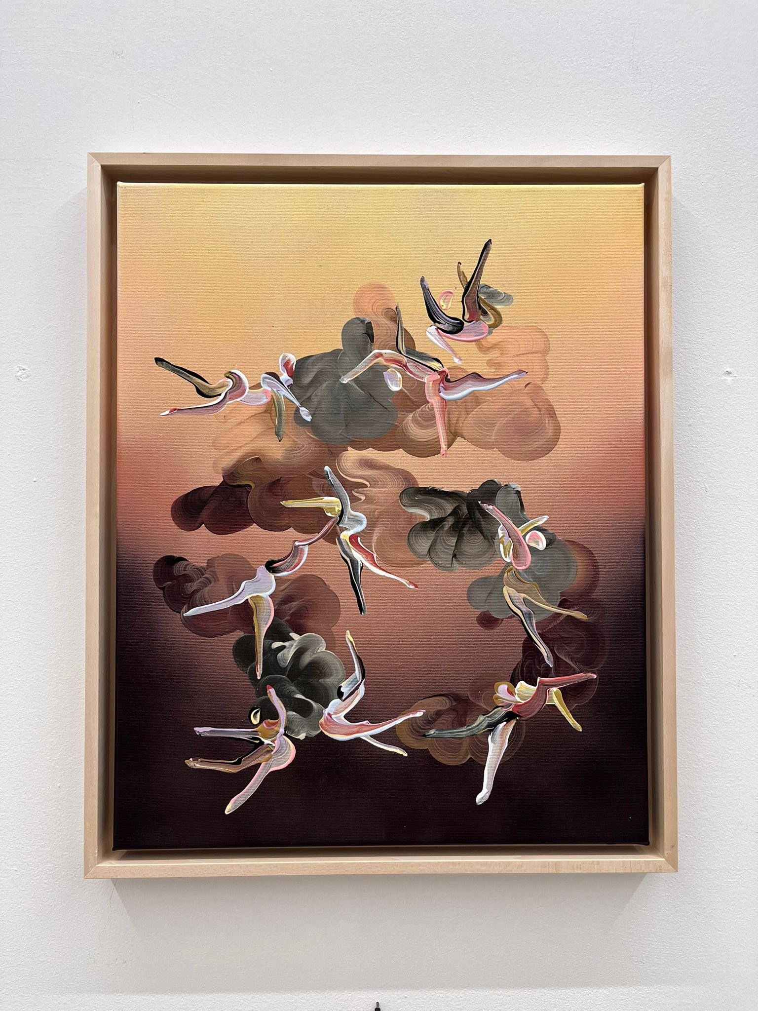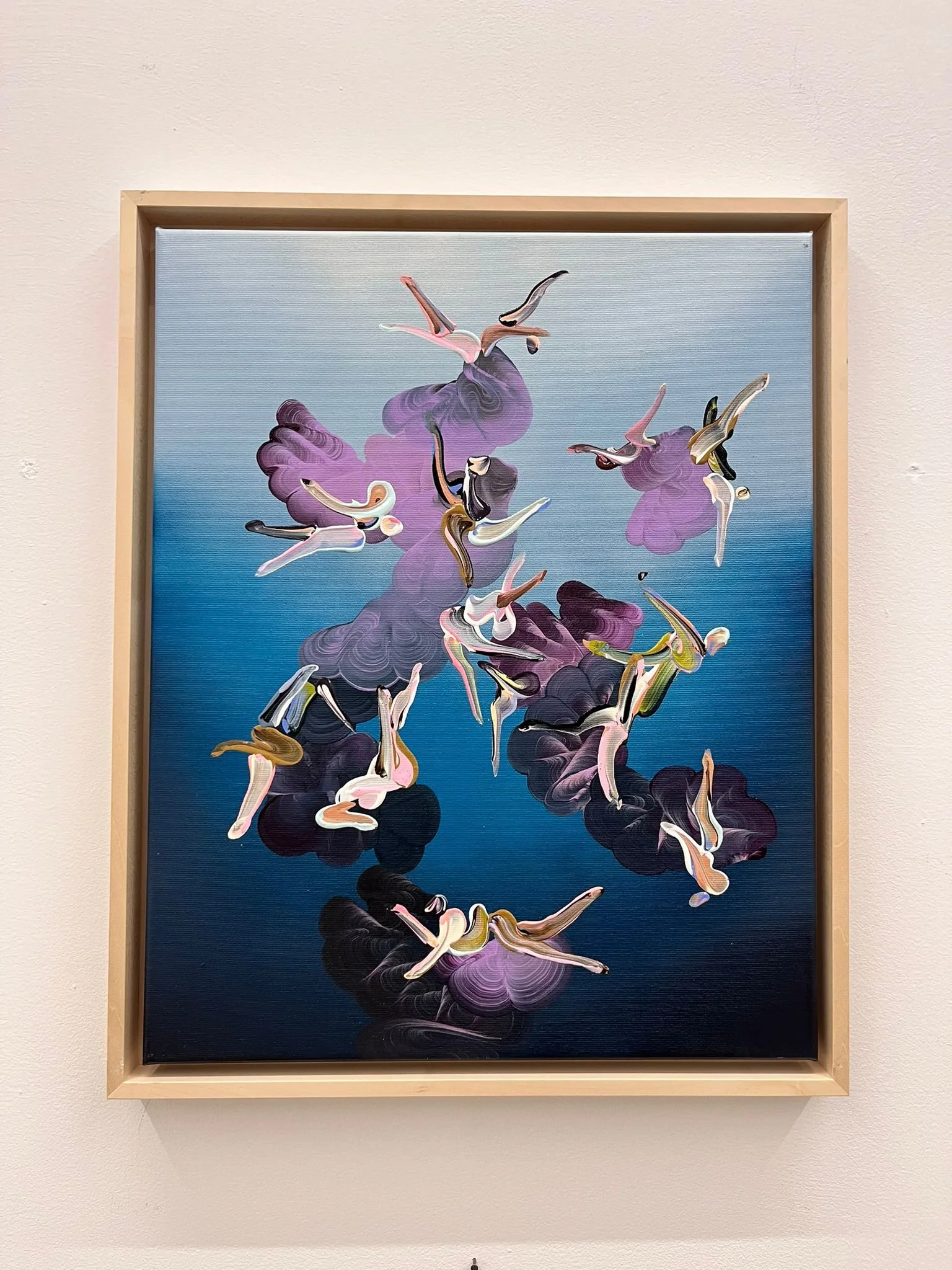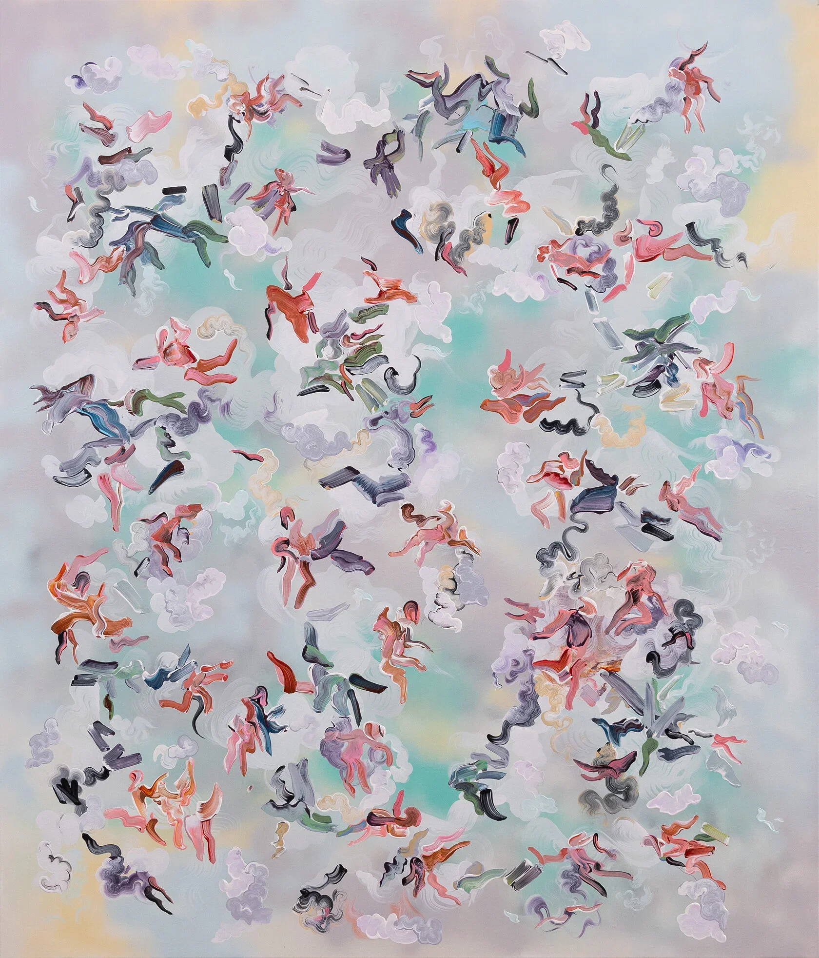 In his series "Modern Fresco," he combines two styles from different artistic eras. Drawing from abstract expressionism, he attempts to depict monumental scenes of the heavens and gods, evoking memories of classical ceiling frescoes from the Baroque period. Rather than fully rendering the scene, he hints at figures and faces, encouraging viewers to engage their own creativity. Kuntze strives for precision and aesthetic quality in every brushstroke. His paintings consist of many layers, beginning with a background gradient created with acrylic sprays. Thin layers of clouds follow, and finally, individual figures and clouds are rendered in thickly applied paint to achieve the best possible contrast.